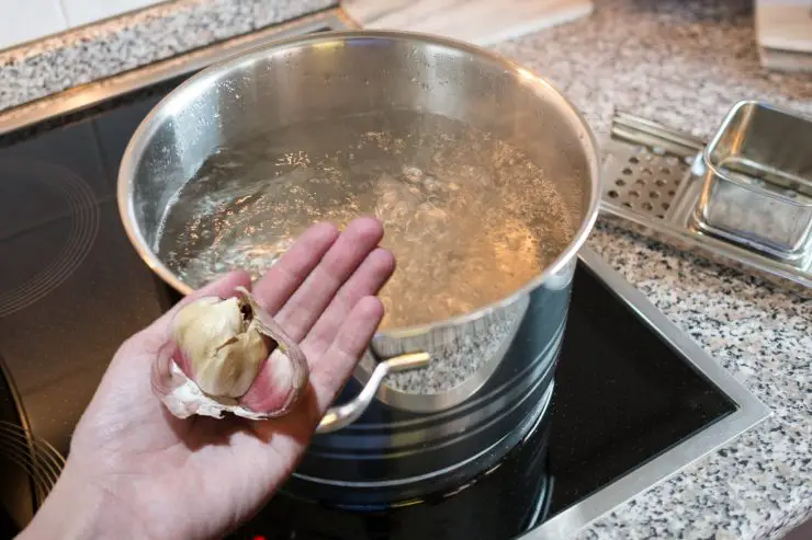 Ferva 5 dentes de alho em uma panela grande, protegido …